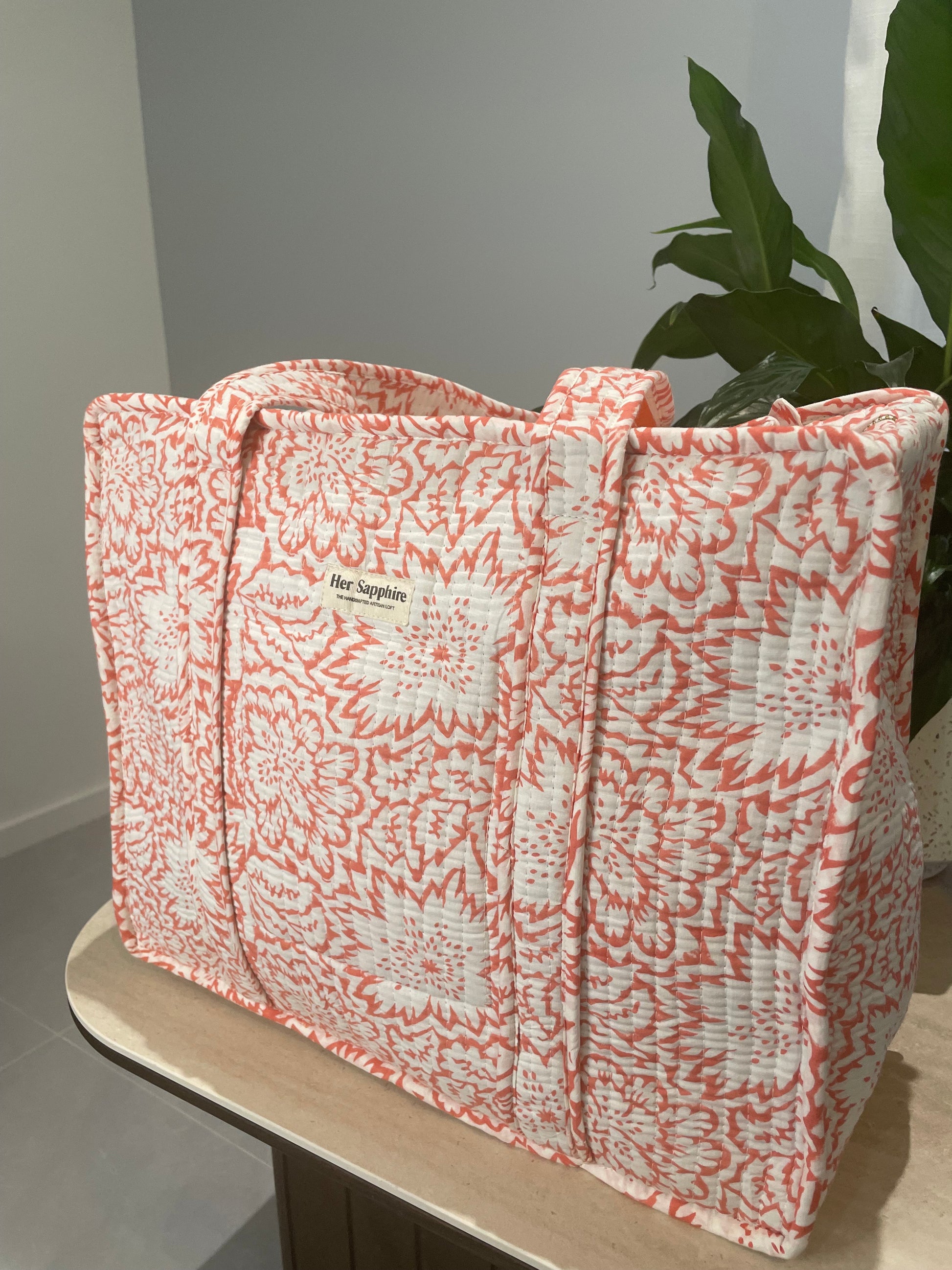 Our hand–block-printed Tote Bags are thoughtfully crafted to be the ideal companion for every adventure. Our Tote Bags combine beauty and practicality. Each bag is double lined, quilted with soft padding, and finished with two interior pocket perfect for your phone, wallet etc. This three-layer tote bag combines two shades of 100% cotton fabric, with a padded middle layer for added comfort and protection.