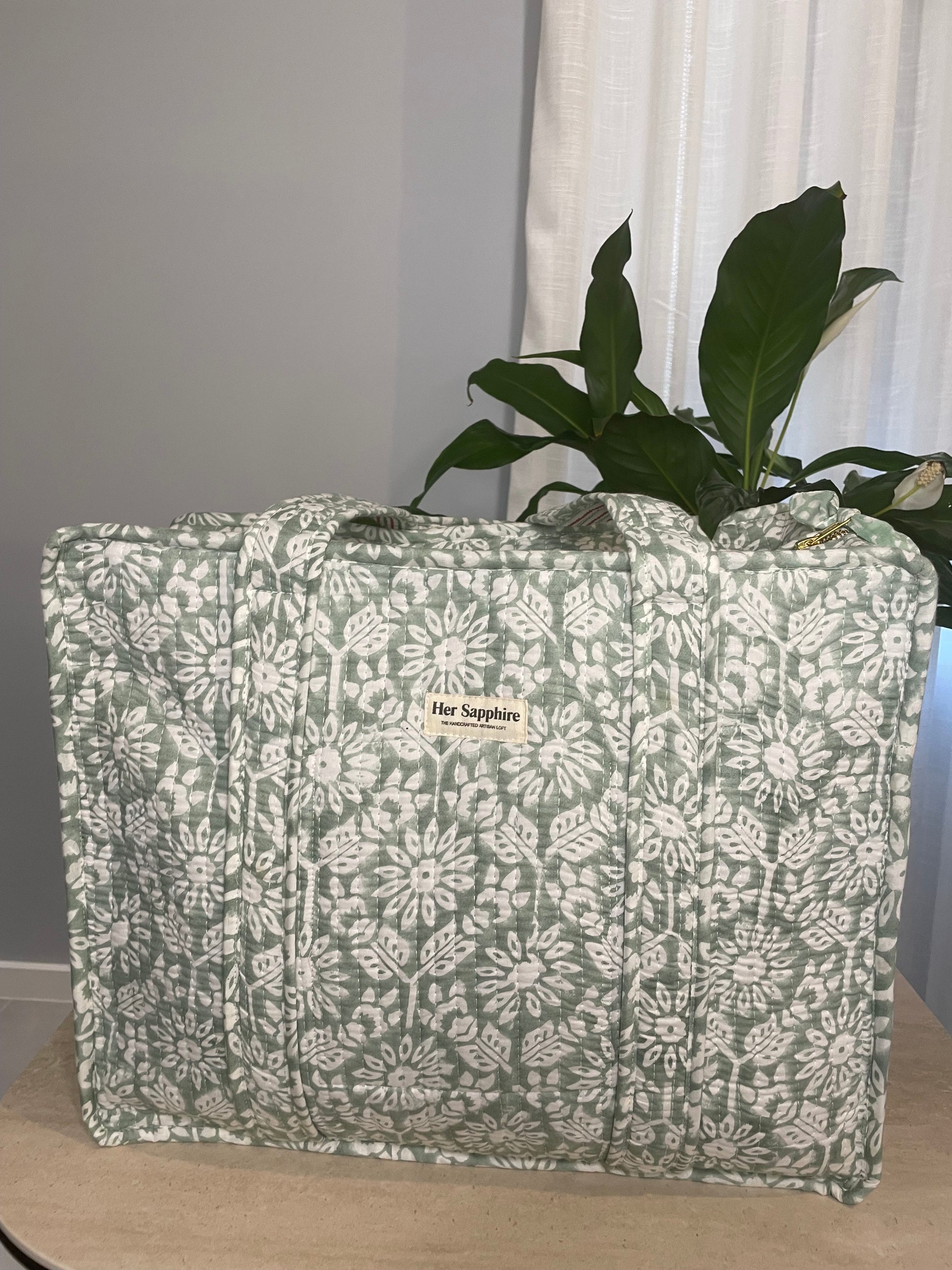 Our hand–block-printed Tote Bags are thoughtfully crafted to be the ideal companion for every adventure. Our Tote Bags combine beauty and practicality. Each bag is double lined, quilted with soft padding, and finished with two interior pocket perfect for your phone, wallet etc. This three-layer tote bag combines two shades of 100% cotton fabric, with a padded middle layer for added comfort and protection.